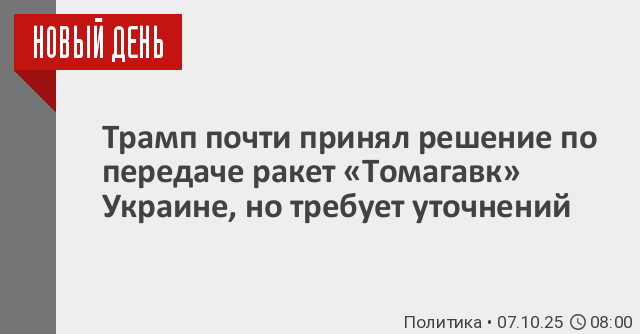 Президент США Дональд Трамп заявил, что «в значительной степени» принял решение по поставкам дальнобойных ракет «Томагавк» Украине, но ему требуется выяснить, куда Киев отправит это оружие.
