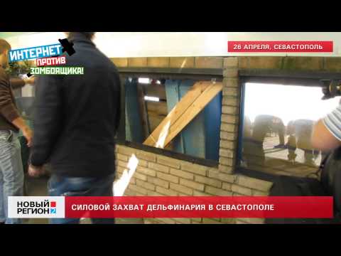 Молодежь из числа прибывших на поддержку севастопольских арендаторов дельфинария попыталась выбить доску, которой было закрыто окно. Однако из помещения их начали отгонять газом из огнетушителя.