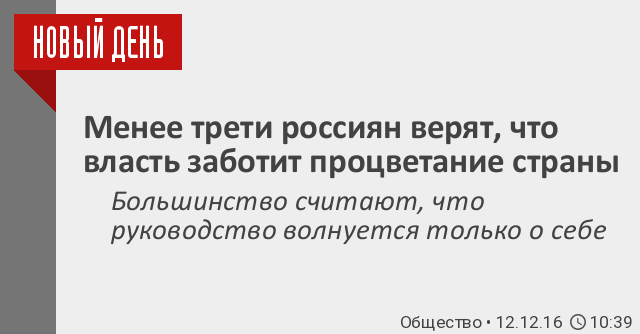 «Люди, которых мы выбираем в органы власти, быстро забывают о наших заботах, не учитывают в своей работе интересы народа», – так считают 58% россиян, а 31% опрошенных «Левада-центром» назвали российскую власть и вовсе «криминальной и коррумпированной». Также 59% респондентов заявили, что для нынешних властей важно не процветание станы, а укрепление и сохранение собственной власти. Противоположного мнения придерживаются 30%, а 11% затруднились с ответом.