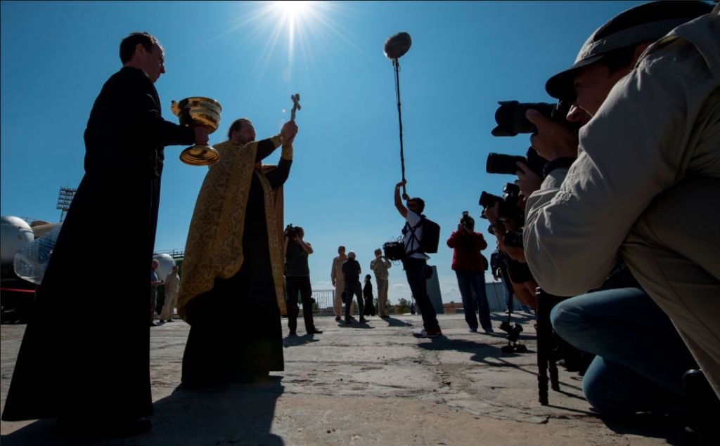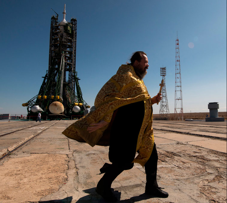 На портале NASA появилась фотография батюшки Русской православной церкви, благословляющего ракету-носитель с кораблем Союз МС-06». Снимок сделал фотограф NASA Билл Ингаллс.
