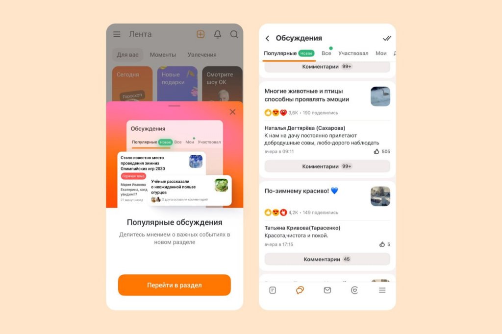 В социальной сети «Одноклассники» перезапустили раздел «Обсуждения». Теперь в нем появилась новая вкладка «Популярные», куда попадают самые обсуждаемые на текущий момент посты и индивидуальная подборка публикаций для пользователя.
