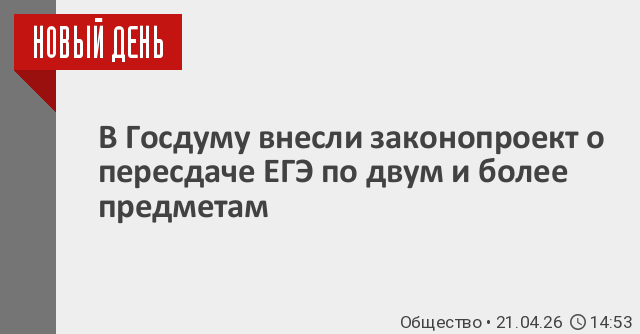 Законопроект о предоставлении права выпускникам пересдать ЕГЭ по двум и более предметам внесен на рассмотрение Госдумы. Документ опубликован в электронной базе нижней палаты российского парламента 21 апреля.