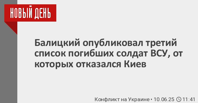 Губернатор Запорожской области Евгений Балицкий во вторник, 10 июня, опубликовал третий список идентифицированных погибших украинских солдат, которых отказался забрать Киев. В списке 30 человек. Об этом глава региона сообщила в своем телеграмм-канале. Два других списка Балицкий опубликовал 7 и 9 июня.