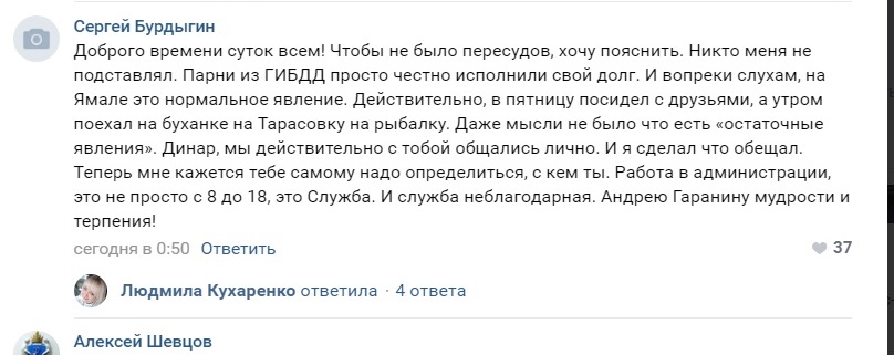 Обновлено 8.11 в 18:22. В соцсетях в обсуждениях новости появился комментарий, оставленный от имени Сергея Бурдыгина (группа «Губкинский – город мечты»). Автор сообщения подтверждает информацию об инциденте и сообщает, что ехал на рыбалку, не подозревая, что после выпитого накануне с друзьями есть какие-то последствия. Также в комментарии содержалось обращение к администратору сообщества с призывом решить, «с кем он». Позднее пост и эти комментарии со стены группы удалили. Агентство «Новый День» публикует скрин. Получить комментарии самого Бурдыгина не удалось: он прочитал смс с вопросом о комментариях в соцсетях и проигнорировал его.