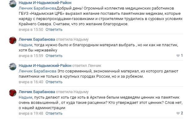 «Огромный коллектив медицинских работников ГБУЗ «Надымская ЦРБ» выразил желание поставить памятникам медикам, которые наряду с первопроходцами-газовиками и строителями трудились в суровых условиях Крайнего Севера. Считаем, что это желание благородное. Пластик – современный, экономичный материал, из которого делают памятники не только в крупных городах России, но и за рубежом», – написали от имени группы «Надым и Надымский район» 3 июля 2019 года.