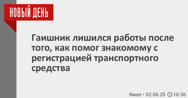 Сотрудник ГАИ в Тазовском лишился работы после того, как решил помочь знакомому, как сообщил «Новому Дню» в пресс-службе прокуратуры РФ по ЯНАО, мужчина, занимая должность государственного инспектора безопасности дорожного движения группы регистрационно-экзаменационной работы отделения Госавтоинспекции, вынес своему знакомому незаконное решение о регистрации транспортного средства, минуя его технический осмотр.