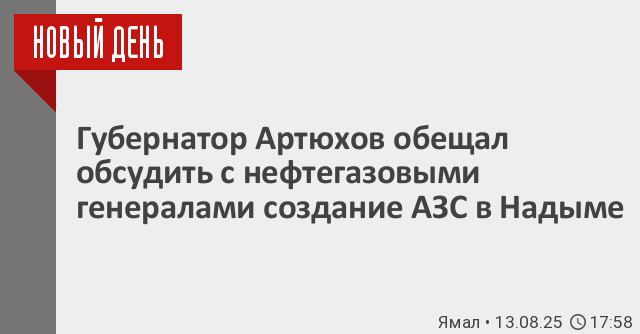 Губернатор Ямала Дмитрий Артюхов пообещал, что займётся вплотную вопросом строительства современной заправки в Надымском районе. Об этом он сообщил в рамках встречи с надымчанами 13 августа 2025 года. Этот запрос регулярно озвучивают жители муниципалитета. Глава района Дмитрий Жаромских во время каждого свего «прямого эфира» комментирует работу властей в этом направлении.